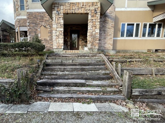 枕木で作られたアプローチ階段は段差や踏面もまばらになっていて、上りやすいとは言えない状況でした。