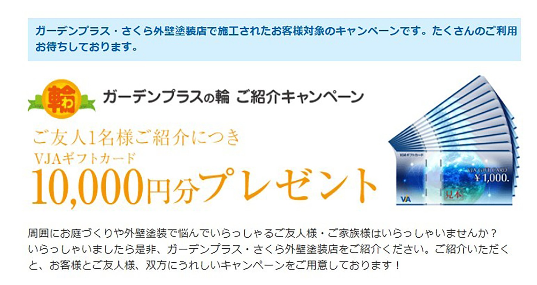 ガーデンプラスではご紹介キャンペーンも実施しております。ご家族、お友達、お隣さんでも構いません。