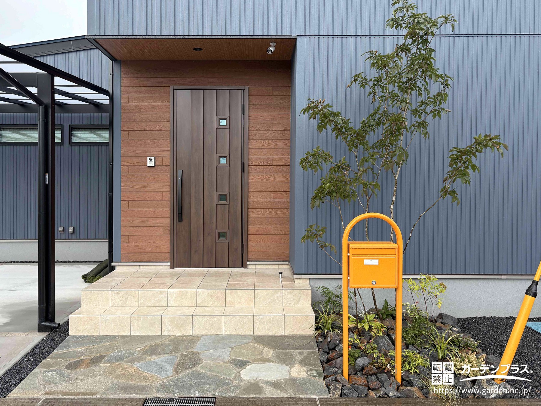 オープン外構のファサードに天然石やロックアイテム、オレンジのポスト、植栽など、要素をまとめるとおしゃれなポイントになりますね。