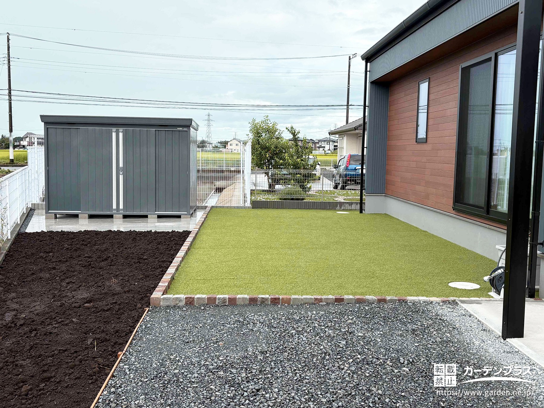 作業しやすいように人工芝の奥は家庭菜園スペースとなっております。