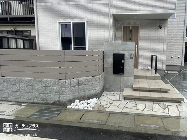 門まわりに隣接する主庭には、化粧ブロックで土留めを設け、目隠しフェンスを施工させていただきました。