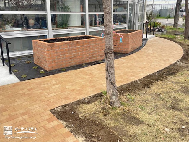 花壇にはSBIC社の「ロイヤルパイン・ブリック パインオレンジ」を使用。ナチュラルな色合いで空間全体に温かみをプラスしました。