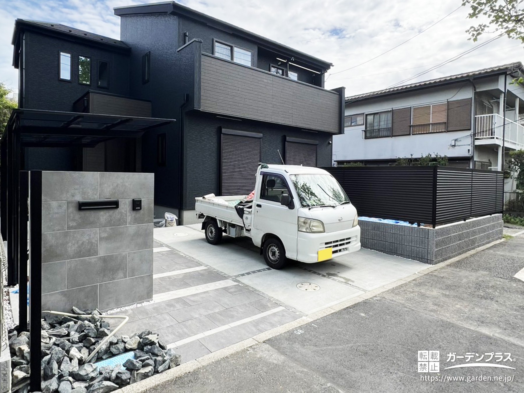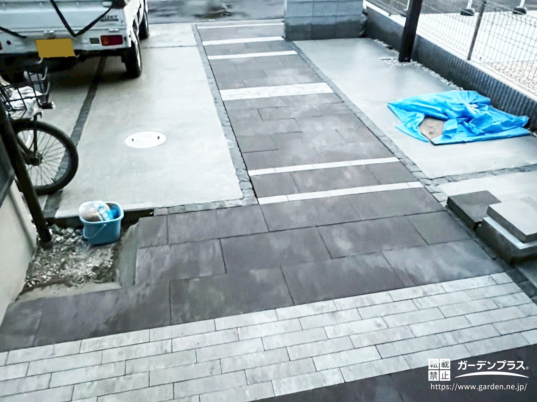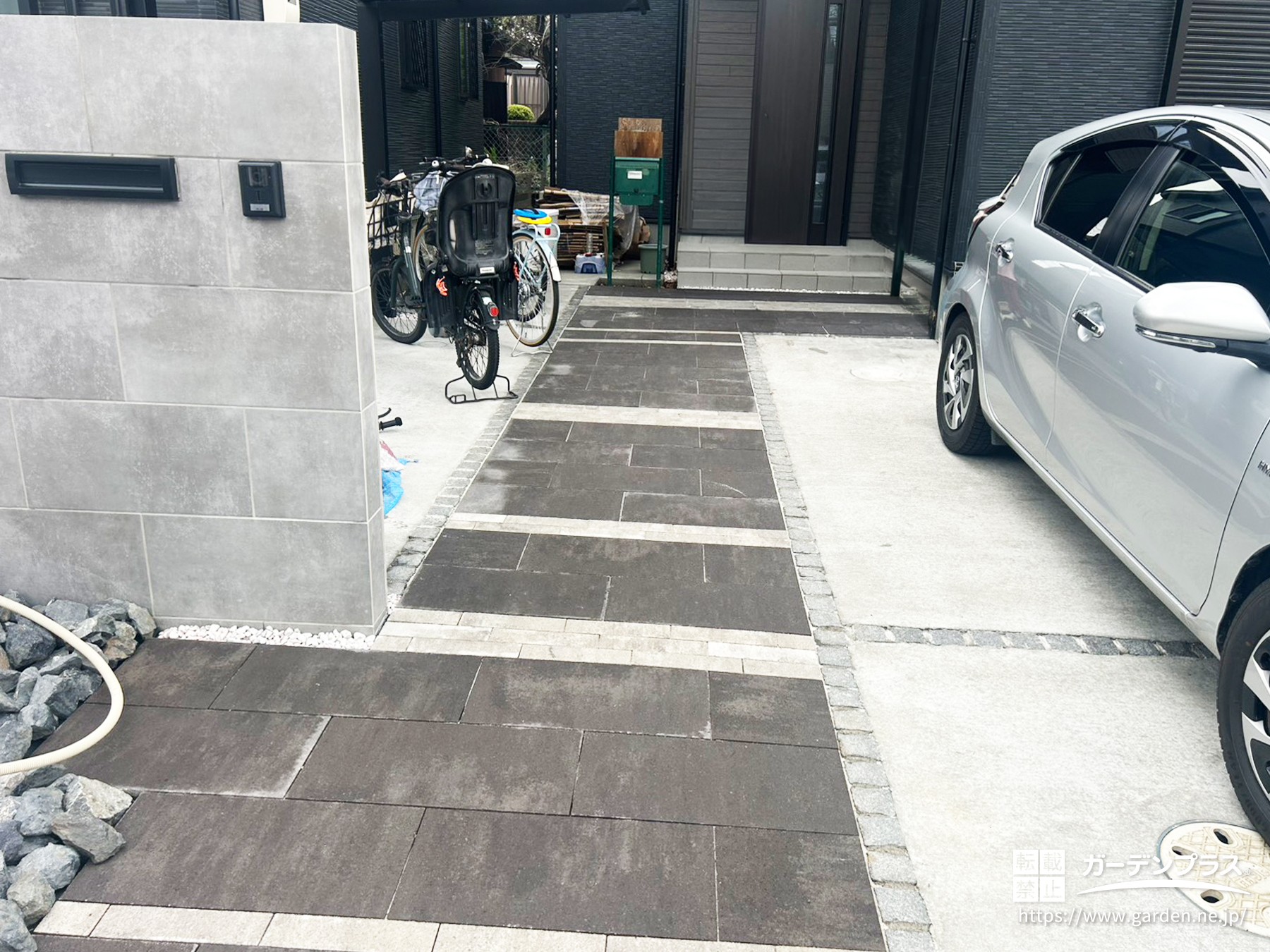 玄関アプローチのインターロッキングデザインが黒い外壁とマッチしていますね。舗装材の色・サイズ違いの組み合わせが外構に個性を生んでくれるデザインとなりました!