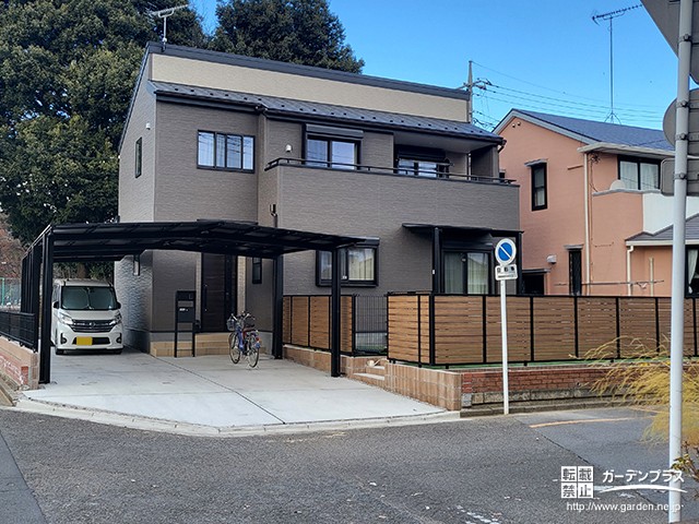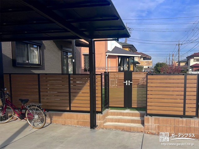 お庭を囲うように、家の外観を引き立てる木目調フェンス「LIXIL フェンスAB YS3型 ブラック×チェリーウッド」も設置。