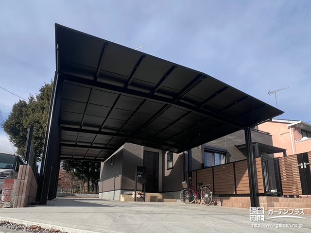最近人気が高まっているブラックポリカーボネート屋根のカーポートは、スタイリッシュで重厚感がありながらも、周囲の景観にすっと溶け込むデザインが魅力です。3台分の広々としたサイズでも圧迫感がなく、お住まいの外観にすっきりと馴染みました。
