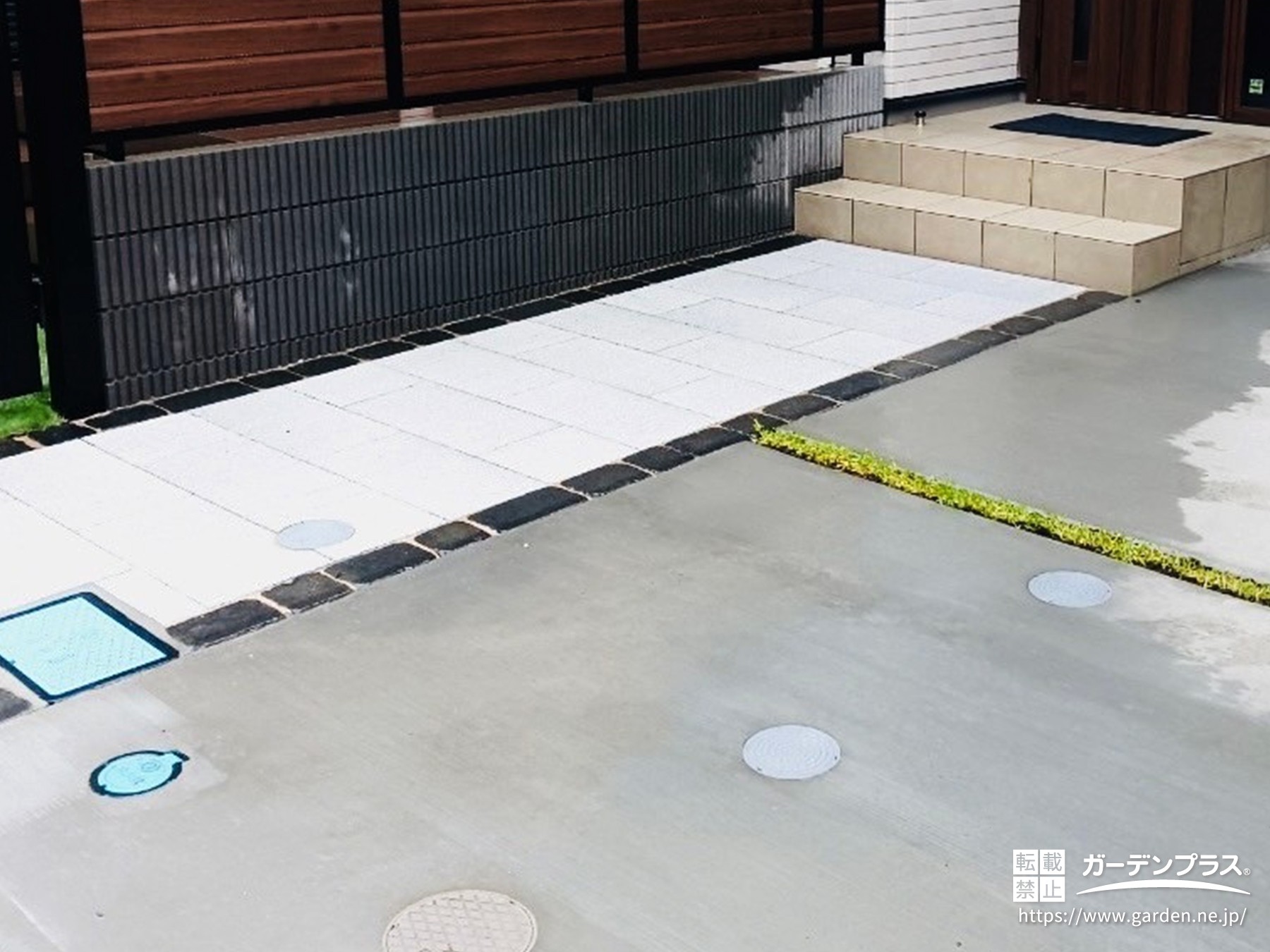 玄関へのアプローチ部分には、タイルとインターロッキングを組み合わせて、モダンな印象に仕上げました。シンプルながら、飽きのこないモノトーンのデザインとなっています。駐車場部分は使い勝手のいいコンクリート仕上げですが、芝目地を入れ、ナチュラルな印象をプラス!無機質な印象を和らげてくれます。水道や電気の点検口もデザインの一部に組み込み、違和感なく仕上げました。