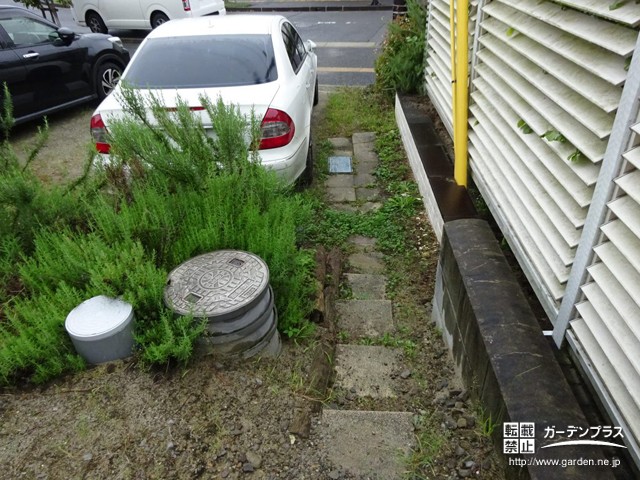 雨水桝と擁壁の狭めの部分にお客様が300角の平板を並べて簡易的な階段にしています。