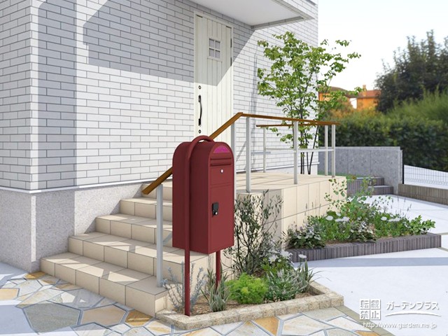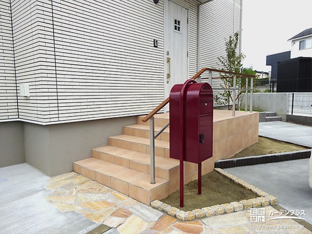 乱形石や赤いボビポストがアクセントになったナチュラルテイストの外構です。