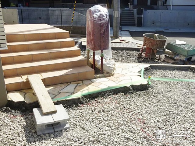 自然石を乱張りした玄関アプローチです。乱形石はひとつひとつの自然石を職人がサイズを調整しながら張っていくため、世界でひとつだけのデザインになります。