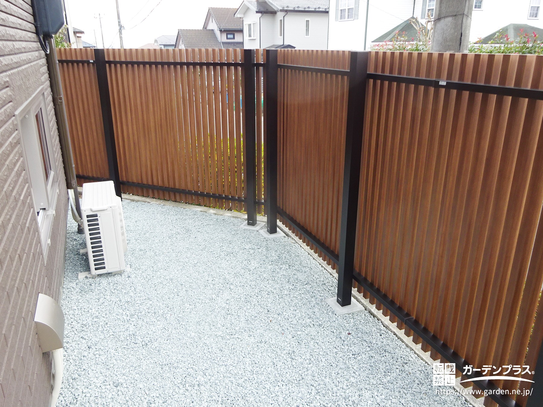 縦格子ならではの上質さと軽やかさがあり、視線をやわらかく遮りながらも圧迫感が出にくいのが特徴です。斜め方向からはすき間が閉じて見えるため、歩行者や道路側からの視線もしっかりカットしてくれます。玄関前をおしゃれ目隠ししたい方に非常に人気の目隠しフェンスです。