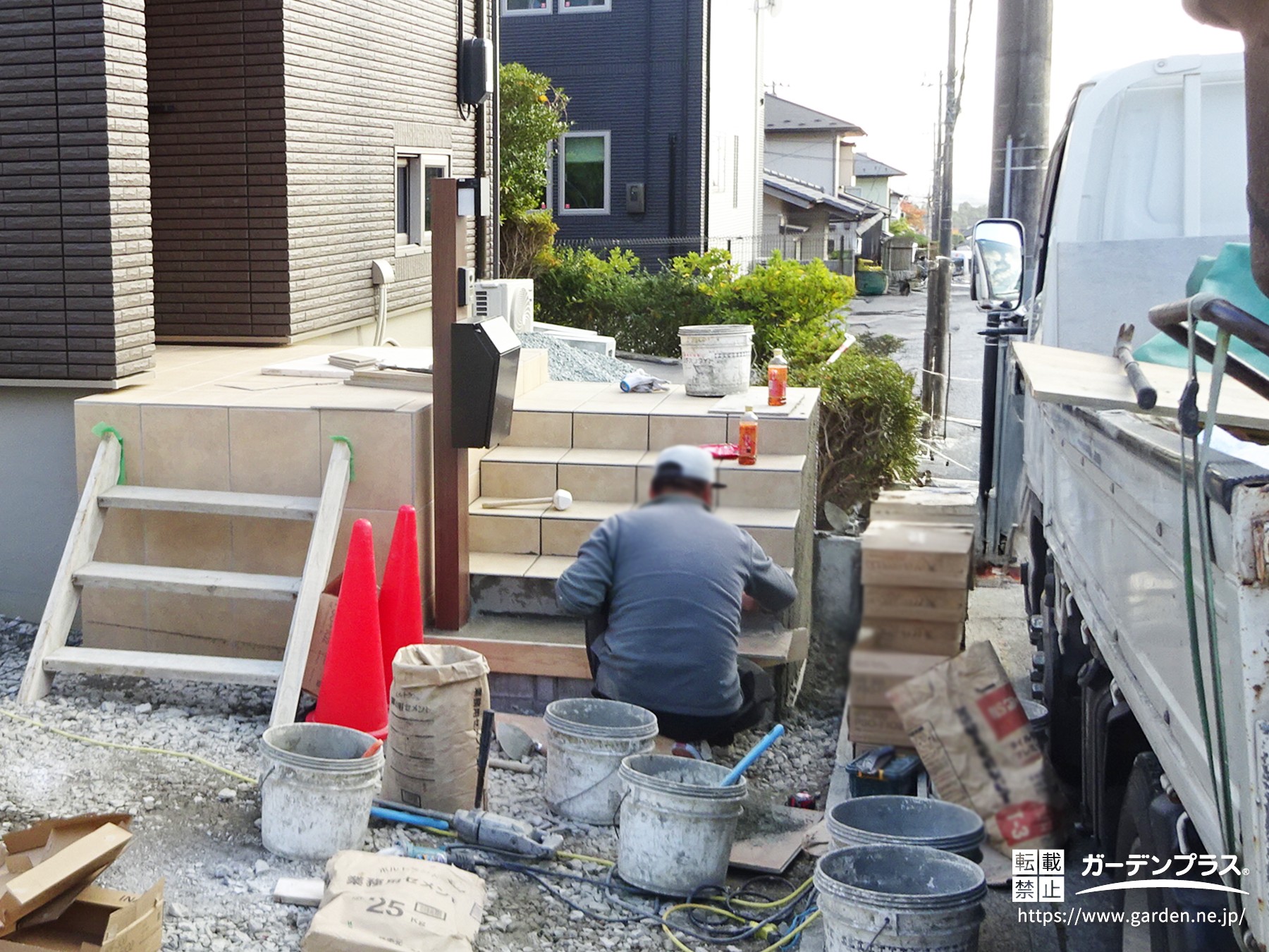 既存ポーチタイル右側にも庭への昇降用に2段作っています。