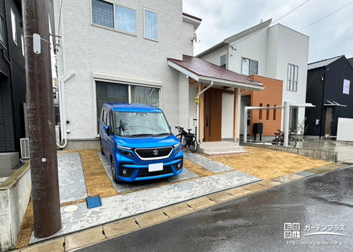 ご希望はお庭らしい景観を兼ねられるように、天然芝を使用したいとのことでしたので、芝を活かしつつ使い勝手のいい駐車スペースをつくらせていただきました。