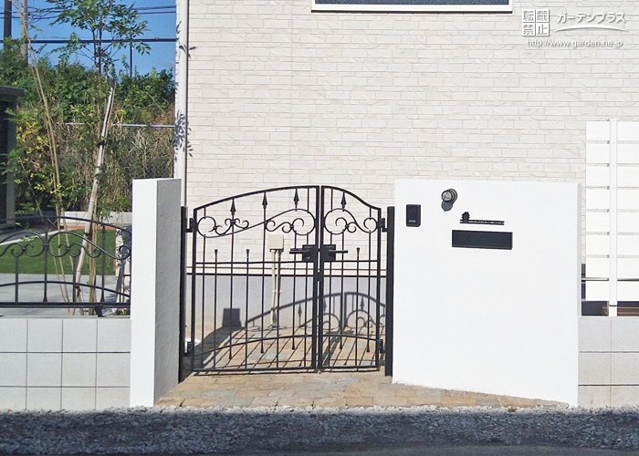 外壁に合わせて、上品な白の塗り壁門柱と門袖を設け、曲線を使ったデザインが美しい鋳物調の門扉を取り付けました。