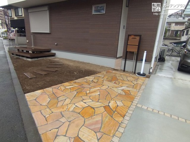 建物の木目調の雰囲気に合わせてご提案したファザード。乱形石でおしゃれなアプローチに♪色目を合わせたピンコロ目地でもっと素敵になりました♪