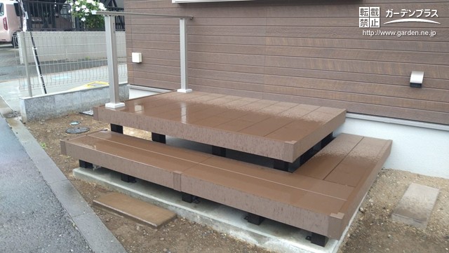 道路からウッドデッキまで、ステップストーンとして木目調のコンクリート製枕木材を敷きました。