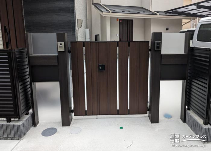 ご自宅のドアに合わせて、、門扉には木目調×ブラックの配色を選びました。