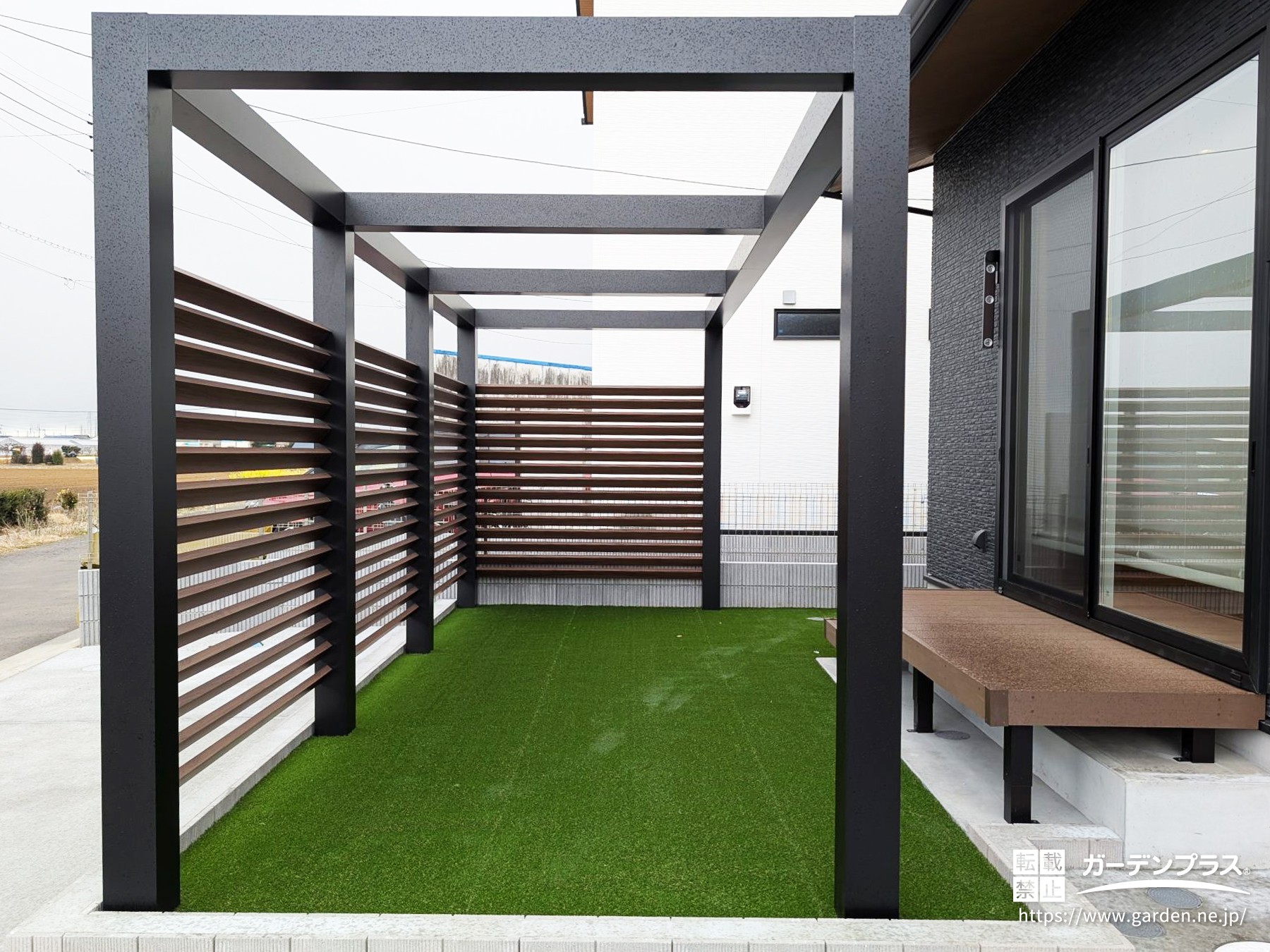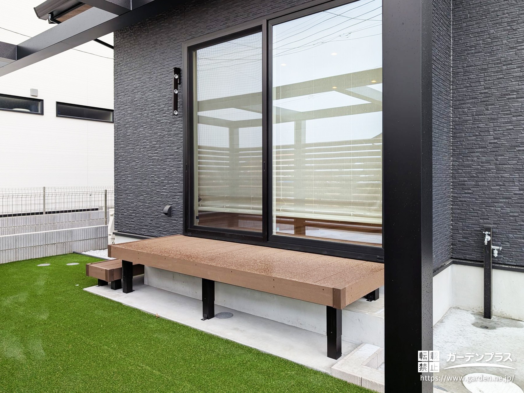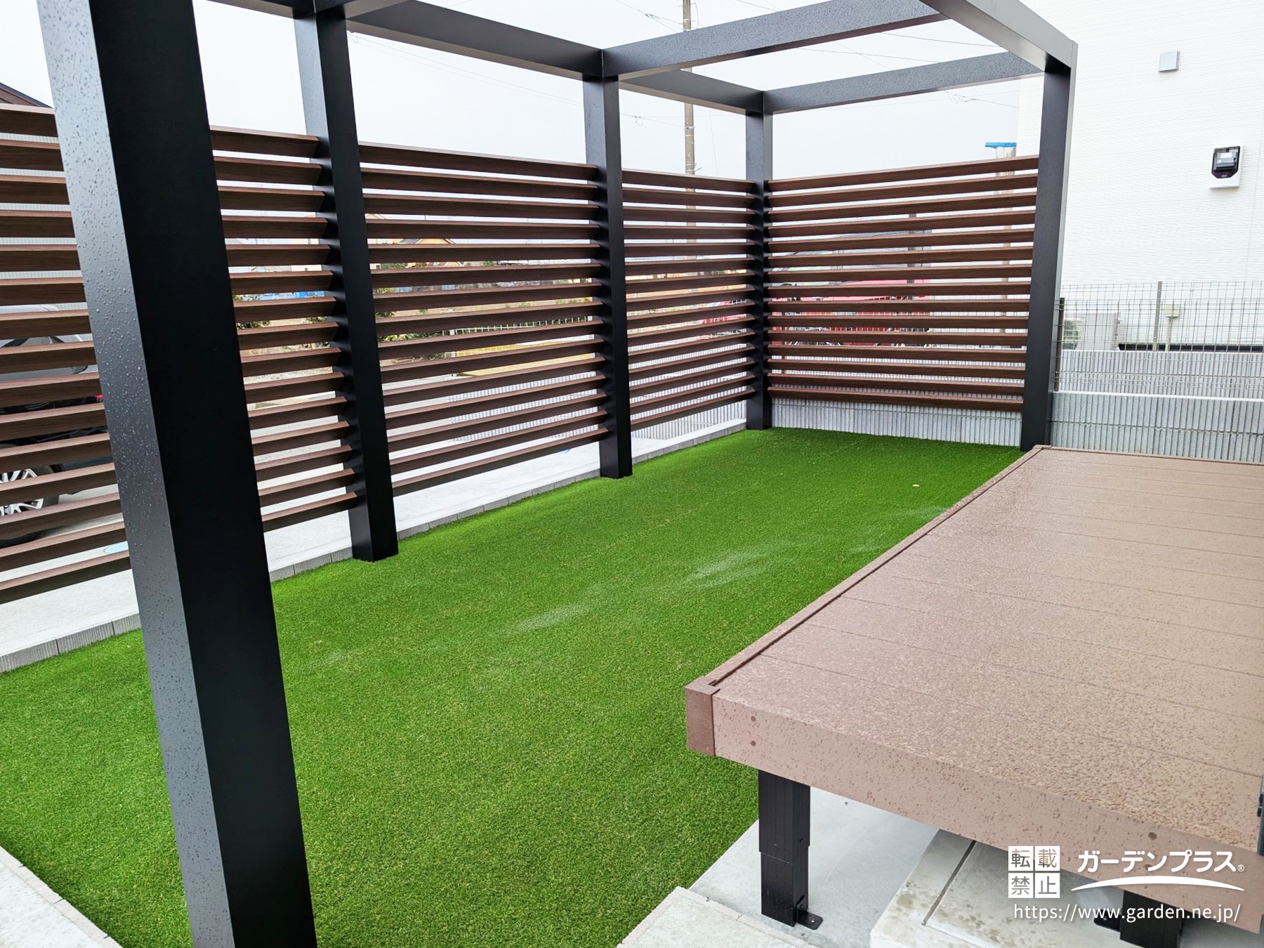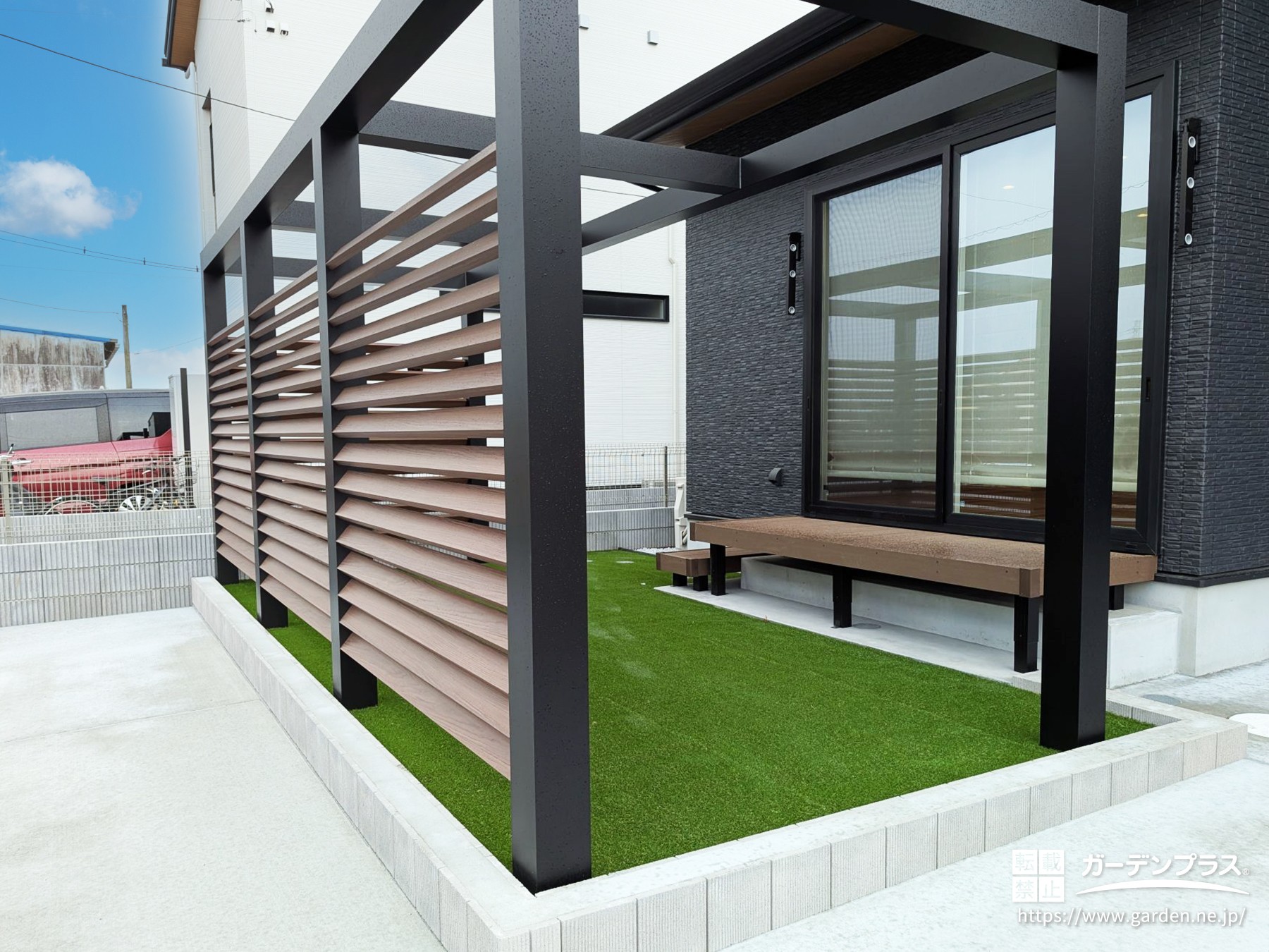 一面に敷いた人工芝との相性もよく、お庭が洗練されたプライベート空間になりました。