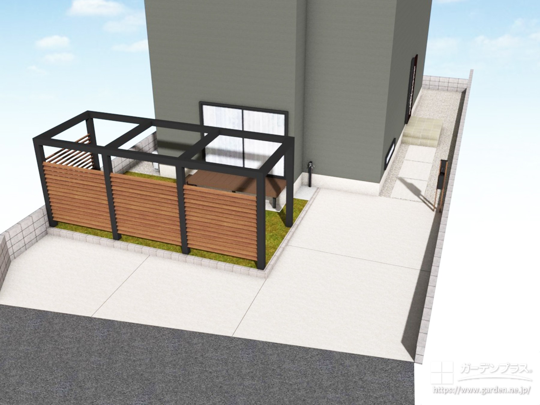 ただお庭を隠すだけでなく、建物全体の「顔」として高級感を漂わせる外構に仕上がりました。