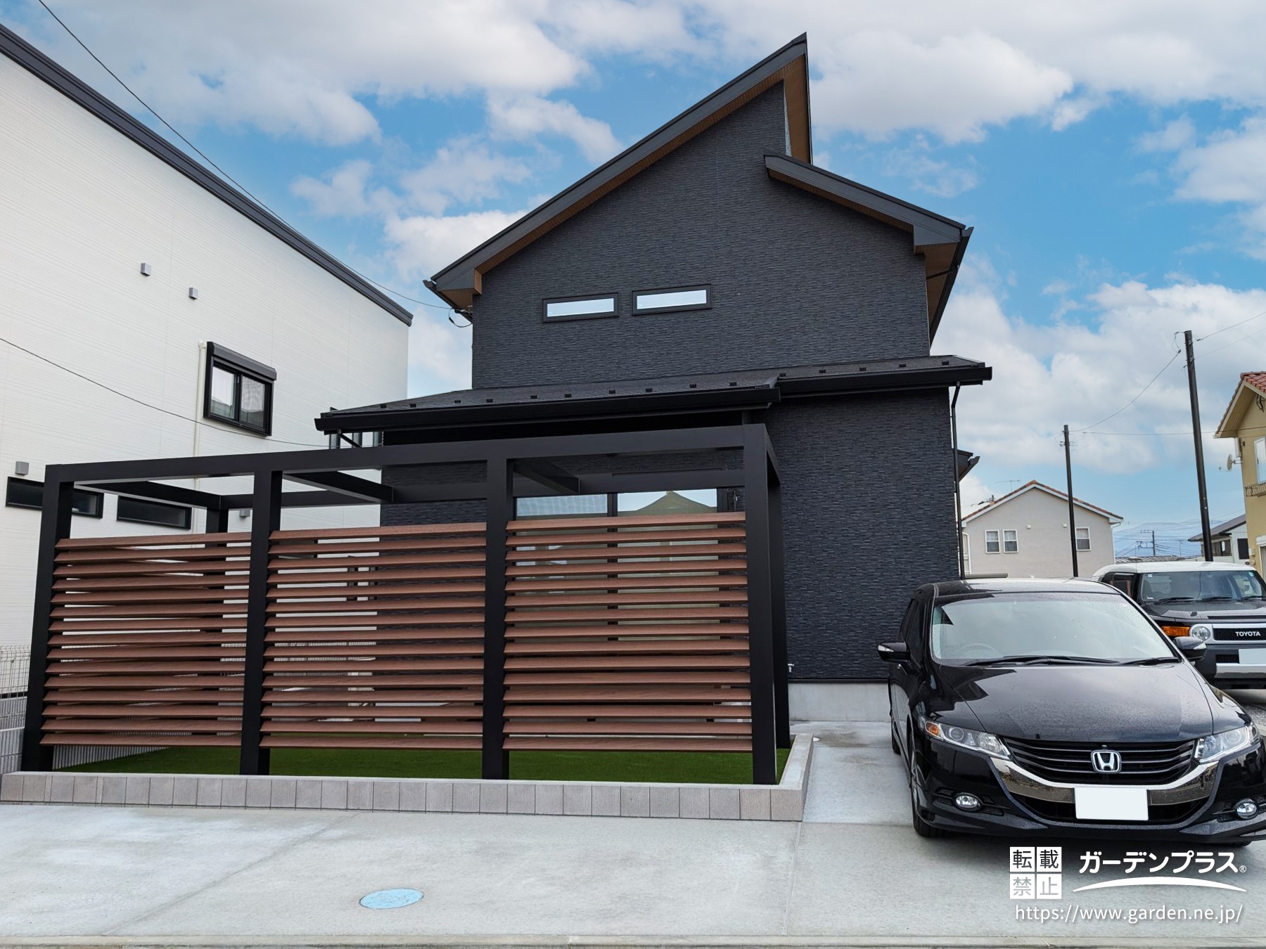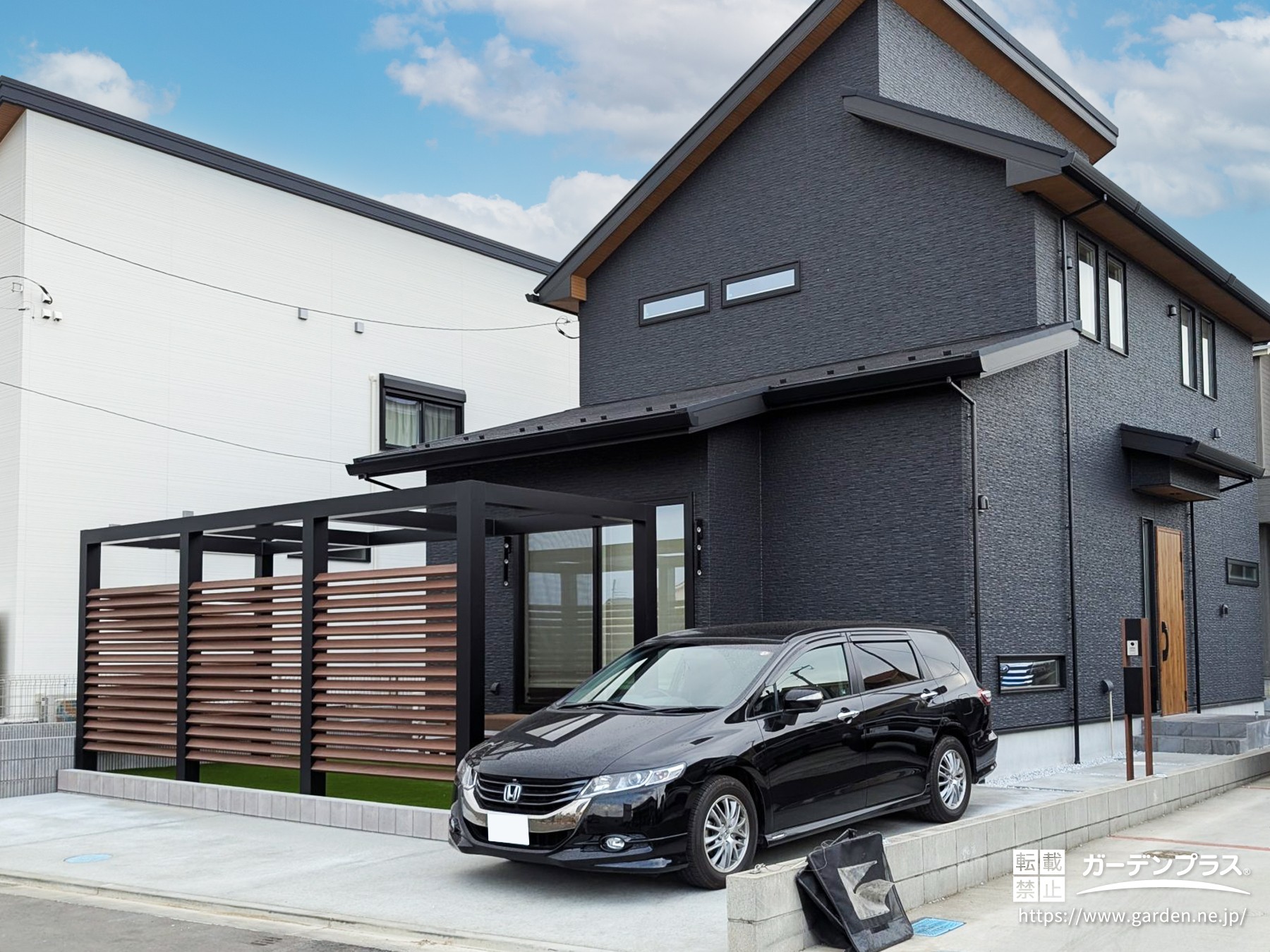Gフレーム・デザインフレーム・機能門柱が建物のブラックの外壁と軒天の木調カラーともコーディネートされていて、とてもかっこいい外構に仕上がりました。