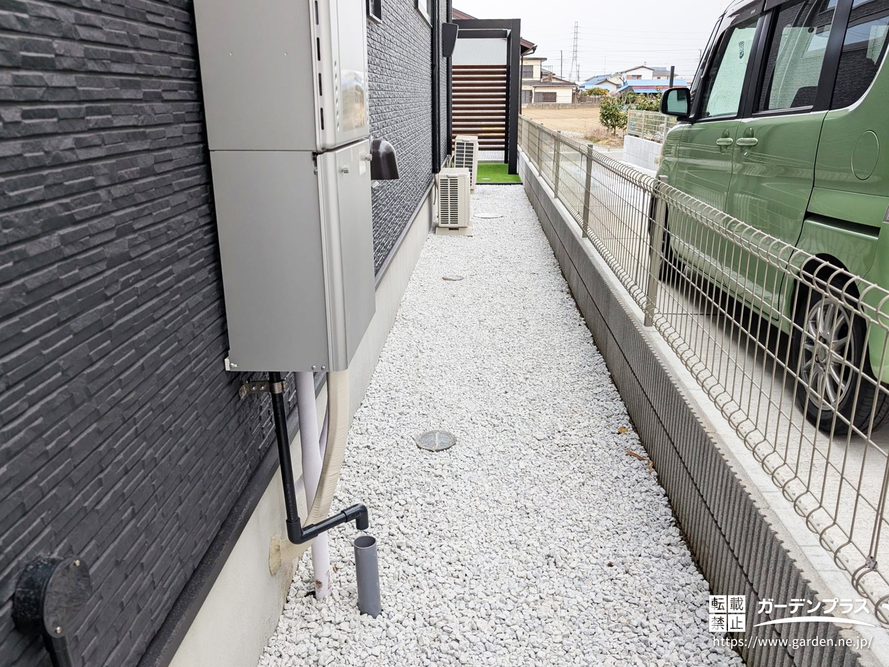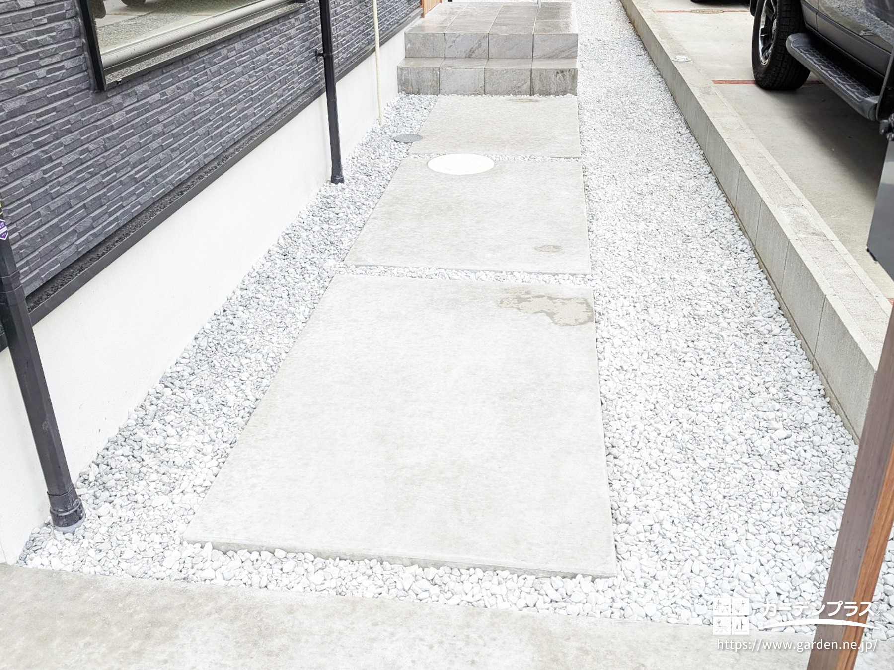 歩行部分は土間コンクリートで舗装することで、毎日の行き来で歩きやすく整えています。