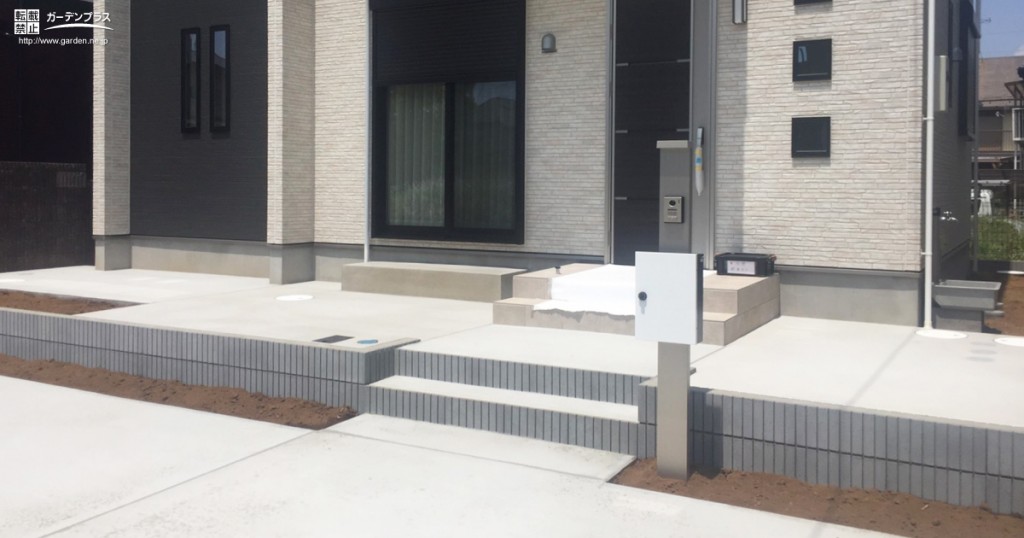 お施主様のご要望通り、お車は建物に対して垂直に停められるように少し広めに設けました。施工前のお写真を見ていただけるとお分かりいただけますが、お住まいがとても素敵なデザインですので、土間コンクリートのシンプルさが建物の良さを引き出してくれています。テラス前は植栽スペースを残して土間コンクリートを打設し、コンクリートテラスとして活用できるように仕上げました。