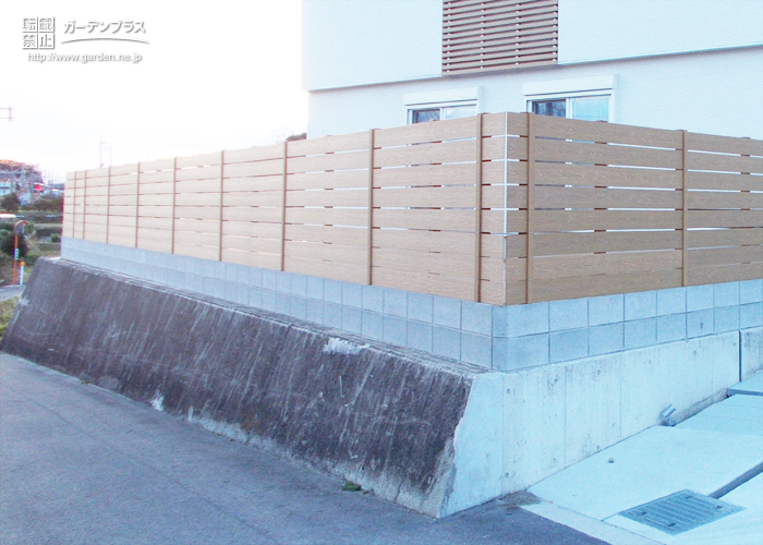 お住まいの敷地が道路面よりも高いところにありますが、そのままでは室内が丸見えでしたので目隠しフェンスを設置しました。お住まいの外壁には細かいスリットデザインの木目が施されているため、施工主様が目隠しフェンスにも明るい色調の横板タイプの木目調フェンスをセレクト。ご依頼いただいた際、フェンスはご自身でつけたいとのご要望がありましたが、こちらで取り付けもさせていただきました。フェンスの設置は一見簡単そうに見えますが、設置する際、水平・垂直に仕上がり良く施工するには職人の技量が必要になります。しっかり施工しなければ、フェンスが転倒する危険性も。ここは職人の技術には自信のある弊社に一任いただきました。