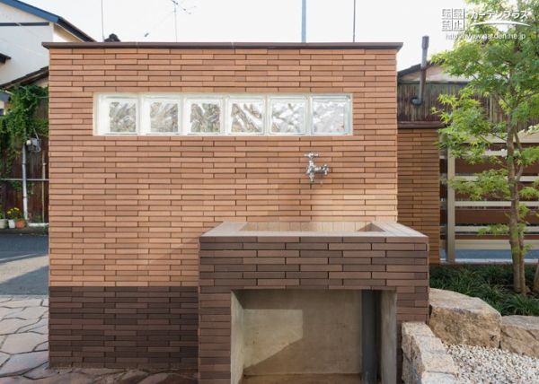 上の写真は門柱に水栓を埋め込み、裏側にはガーデンシンクを一体化させた個性的な造り方です。