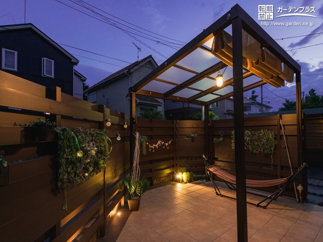 採光しつつも目隠し性もあるクリアマットのポリカパネルを格子にはめ込んだフェンスなので、日当たりの良いタイルデッキやお家の中まで、光を遮ることなく取り入れることができていますね。