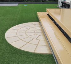 サークルテラスでアクセントを加えた開放的な人工芝のお庭