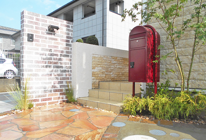 お車を停めやすくするために駐車スペースを拡張し、土間コンクリートでフラットに仕上げてゆとりある動線へと整えました。建物まわりの圧迫感が軽減され、お車の出し入れもしやすい快適なスペースに生まれ変わっています。玄関前には機能門柱を設置し、カームブラックの落ち着いた色味が外観を引き締めながら、照明付きで夜間の視認性にも配慮しました。宅配ボックスも組み込むことで、不在時でも荷物を安心して受け取れる便利な玄関まわりに。使い勝手と見た目がどちらも向上した、暮らしに寄り添う外構の完成です。