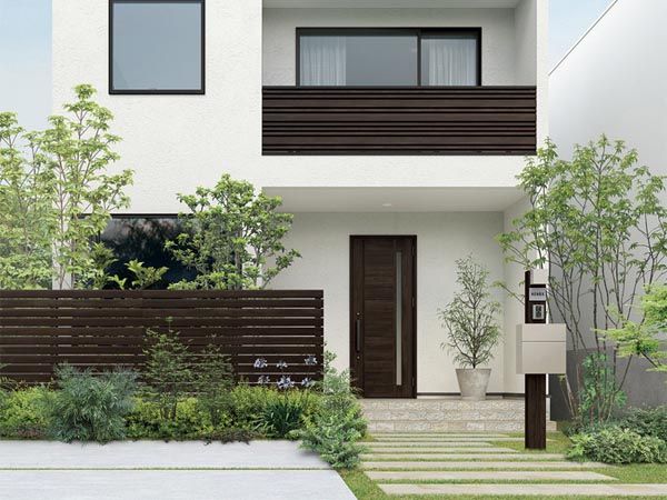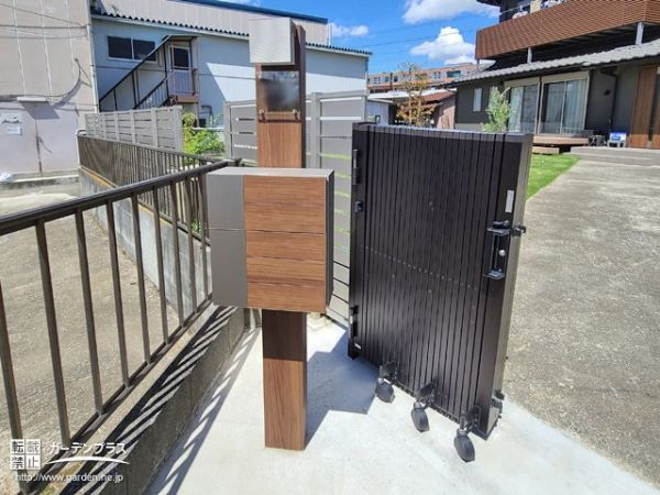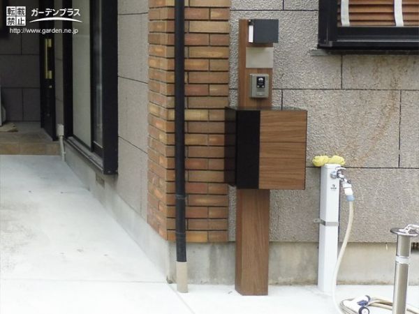 シンプルなポール型機能門柱に木目の温かみをプラス