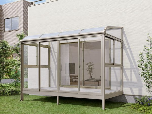 サニージュはLIXILのスタンダードなテラス囲いで、サイズバリエーションやオプションが豊富なため、犬走りから主庭まで、特殊条件のお庭にも対応できます。R型は屋根部分をカーブさせた上品なデザイン。雪がゆっくり滑り落ちてくれるため、積雪のある地域では人気です。またコンクリートテラスやタイルデッキの上に設置できる土間納まりタイプと、テラス囲い内に床材を張る「床納まり」の2つのタイプをご用意。土間納まりは半屋外という雰囲気で、足元が汚れても水洗いなど掃除がしやすいのがポイント。床納まり仕様は、室内と高さを合わせて床を施工するので、お庭よりも室内を延長させた空間に近く、キッズルームや猫ちゃんがひなたぼっこするためのお部屋にもおすすめです。開口部の開き方やオプションも豊富なので、設置場所や目的に合わせてカスタマイズができます。