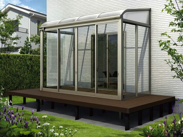R型は屋根のカーブが上品で優しいイメージ。タイルデッキやテラスの上に設置する「土間納まり」のほか、内部に床材を取り付ける「床納まり」、ウッドデッキの上に設置する「デッキ納まり」があります。開口部の開き方やオプションも豊富なので、設置場所や目的に合わせてカスタマイズができます。