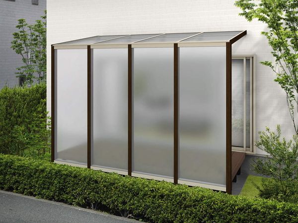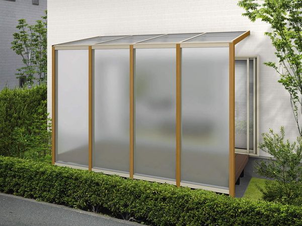 屋根と正面デザインパネルで構成される外付けのルーフエクステリアです。窓を開けて開放的な雰囲気を楽しめるほか、犬走りや幅の狭いお庭など、隙間スペースへの設置もおすすめ。また正面パネルには目隠しタイプもあるため、お隣さんと距離が近い場所でもプライバシーに配慮することができます。