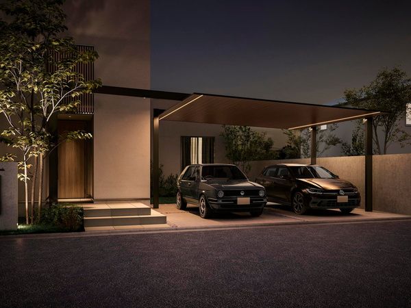 スタイリッシュなデザインで人気の「カーポートSC」のワイドタイプです。2台用となると屋根のサイズも広くなり、存在感も十分。支柱は4本になり、太い2本の梁が屋根を支えますが、屋根の内側はシームレスなデザインのままです。梁を延長させ、アプローチ動線を遮らない設計にすることもできます。アルミ屋根が大きい分、屋根下が暗くなりますので、防犯対策も兼ねてダウンライトやシームレスライトなど照明と組み合わせた施工がおすすめです。