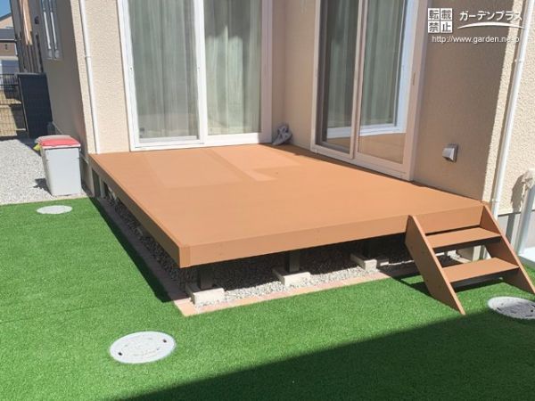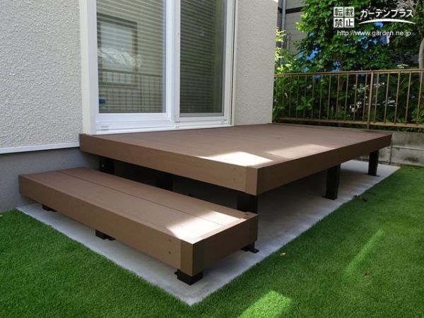 マージウッドデッキは人工木を採用しており、天然木と比べて強度の低下や変色が少ないのが特徴。腐敗やシロアリ食害に対する耐久性が強く、いつまでも美しくお庭の快適空間を演出します。また同素材を使ったステップやデッキフェンスもございます。