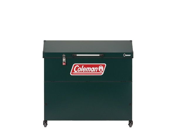 深みのあるコールマンカラーのグリーンにレッドの銘板がアクセントの「ヨドストレージボックス Coleman モデル」。
