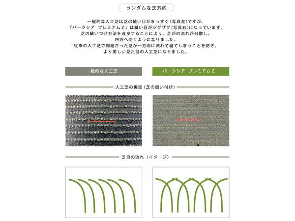 一般的な人工芝が直線縫いであるのに対し、「パークシア プレミアムZ 芝丈35mm」は芝の縫い付け方向をジグザグに改良。これにより芝が様々な方向へ向き、芝が寝てしまうのを防ぎ、よりフカフカで美しい見た目を長く保ちます。