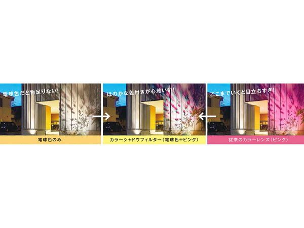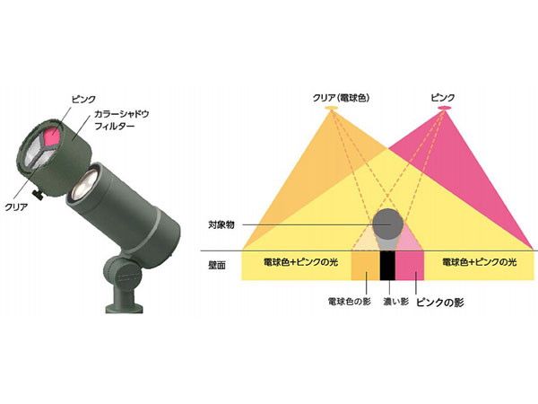 「ガーデンアップライト オプティ スリム」は、電球色で照らしながら、影の一部に色がつく不思議なライティングを実現しました。