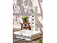 角を意識した水栓柱とパンの組み合わせになっており、ホワイトの木目調になっており、正面には四角くくり抜きがありデザイン性の高い商品です。