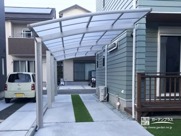 駐車スペースに土間コンクリートを打設しました。水たまりを気にせずお車へ乗り降り可能に。お住まいとのテイストを考慮して、人工芝でナチュラル感をプラスしました。