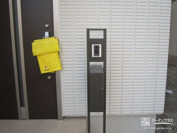 表札とインターホン、ポストが一体型になったスマートな門柱です。玄関ドアの色とも調和しています。表札にはLED照明も内蔵されており、夜間も安心です。