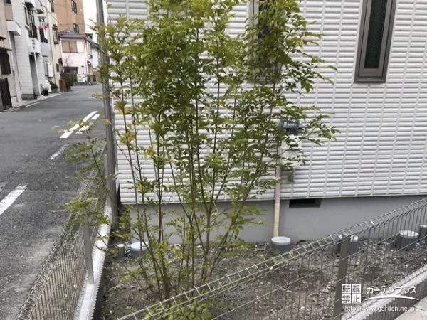 道路に挟まれた三角形のスペースに瑞々しいシマトネリコを植えました。成長が早い常緑樹で、お庭の一画に爽やかな印象を与えてくれます。