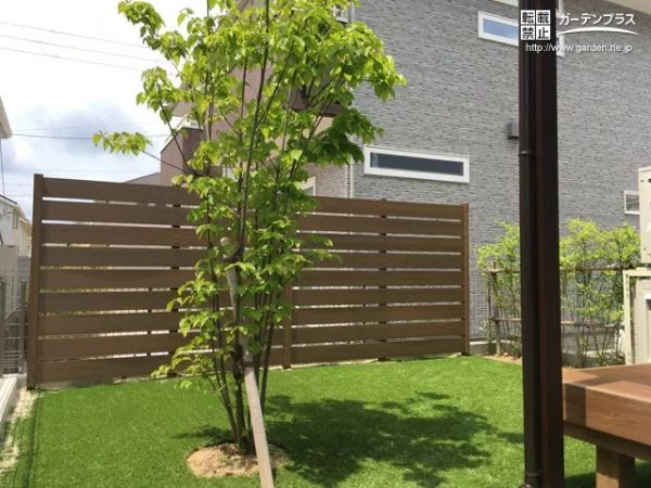 隣家のテラスや道路と隣り合う境界には、木調のフェンスを設置し、目隠しをしました。庭木の背景としても爽やかでナチュラルな雰囲気です。