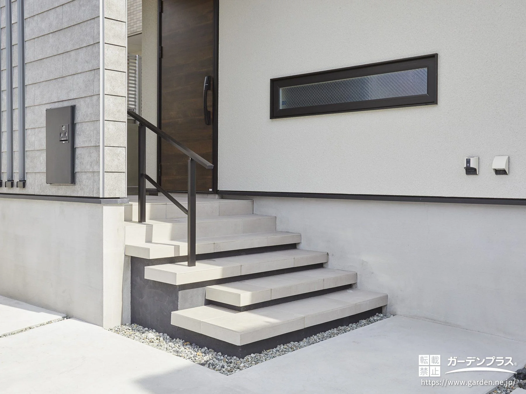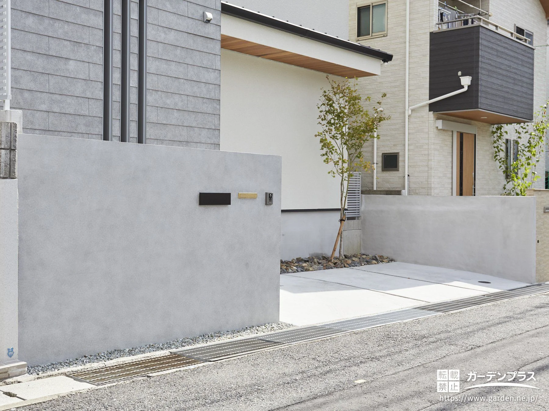 新築外構一式工事を承りました。グレーを基調とした、無彩色のスタイリッシュなファサードデザイン。門柱は塗装でコンクリート感を再現し、無機質で洗練された印象に仕立てました。ポストや手すりなど黒のエクステリアをアクセントとして使い、ぼんやりしがちなグレートーンをすっきり引き締めています。
