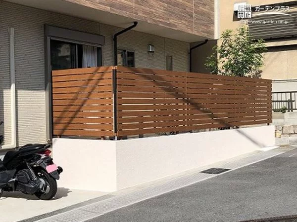 タイルデッキの周りはコンクリートブロックを基礎として積み、塗り壁仕上げにしました。上部には横スリット入りの木調フェンスを設置。視線の高さ程度に合わせることで閉塞感を抑え、木調のナチュラルな雰囲気でのびのびと過ごせるスペースになるよう設計しています。