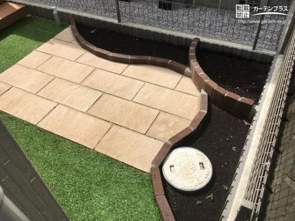 主庭:人工芝 + インターロッキングテラス エスビック パエリア336 サルディ