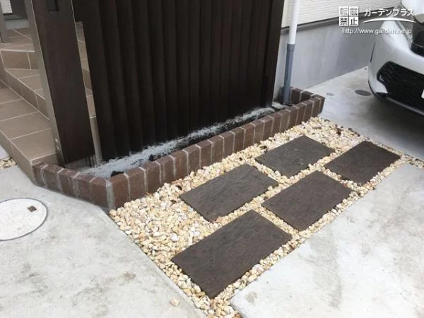 アプローチ花壇周り:エスビック アクシアランバー ブナ + 化粧砂利 メイクランド ステラ サターン
