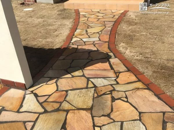 アプローチ:乱形石貼り ソルンフォーフェン イエロー系 + レンガライン