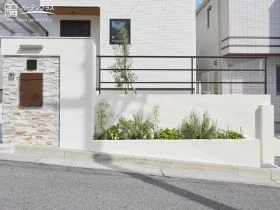 新築外構一式工事を承りました。建物と外構の調和を意識して、直線的なラインを多用したまとまりのある外構デザインに。高低差のある立地条件を生かし、立体感のある外構に仕立てました。門柱裏手のアプローチはベビーカー置き場になるなど、お施主様のお客様に対するホスピタリティもデザインに取り込んでいます。門柱横の植栽や人工芝のお庭など、控えめながらも緑の美しさが引き立つ新築外構デザインです。